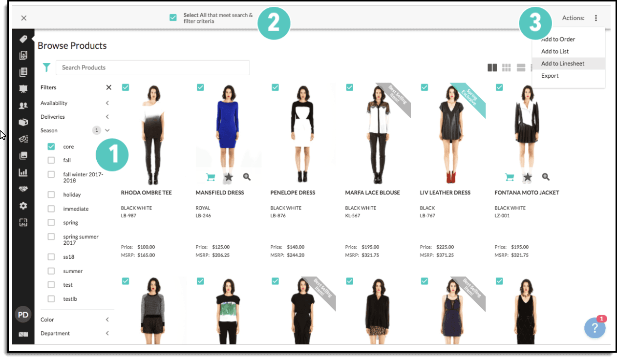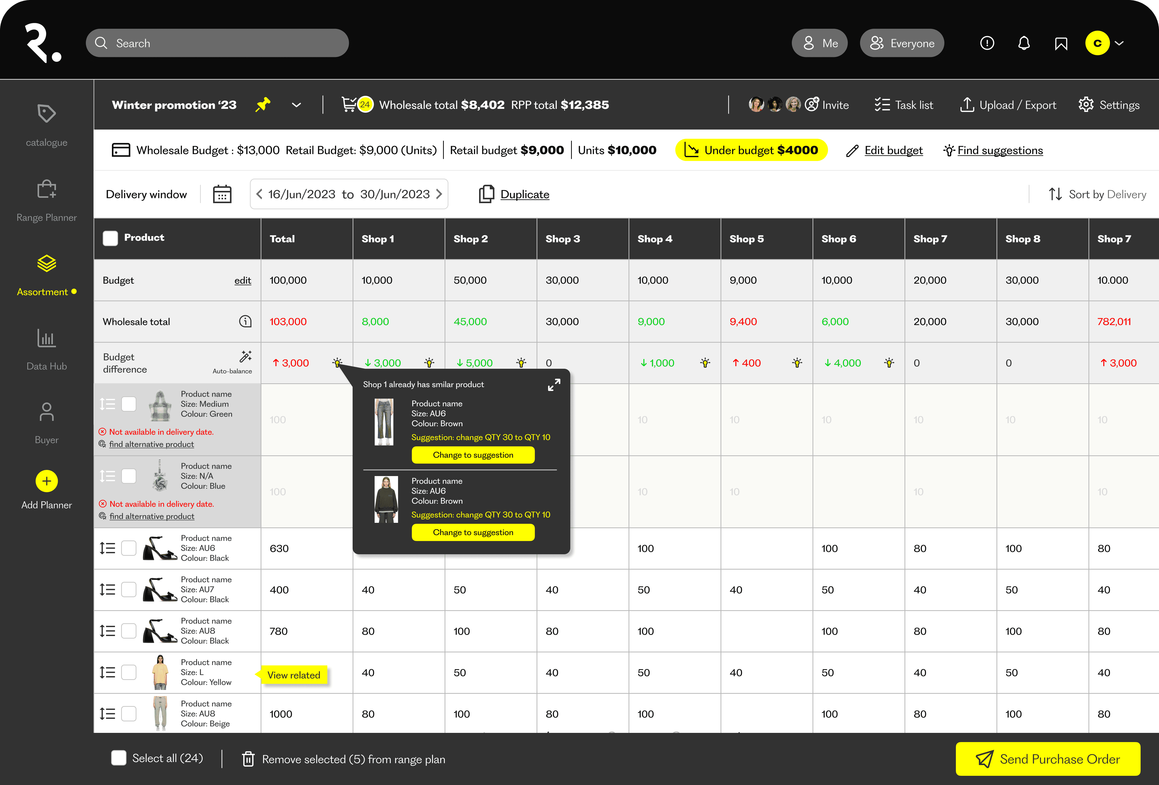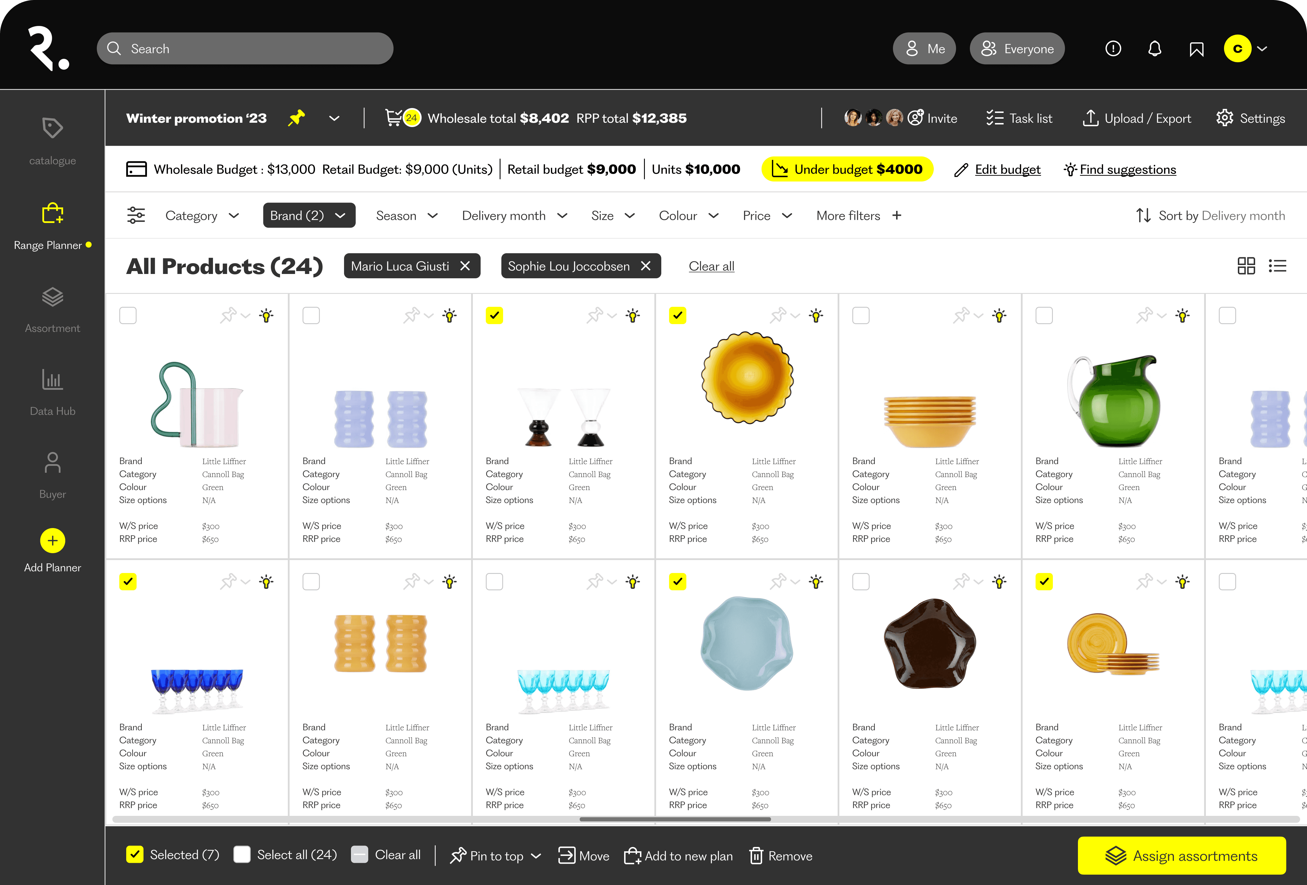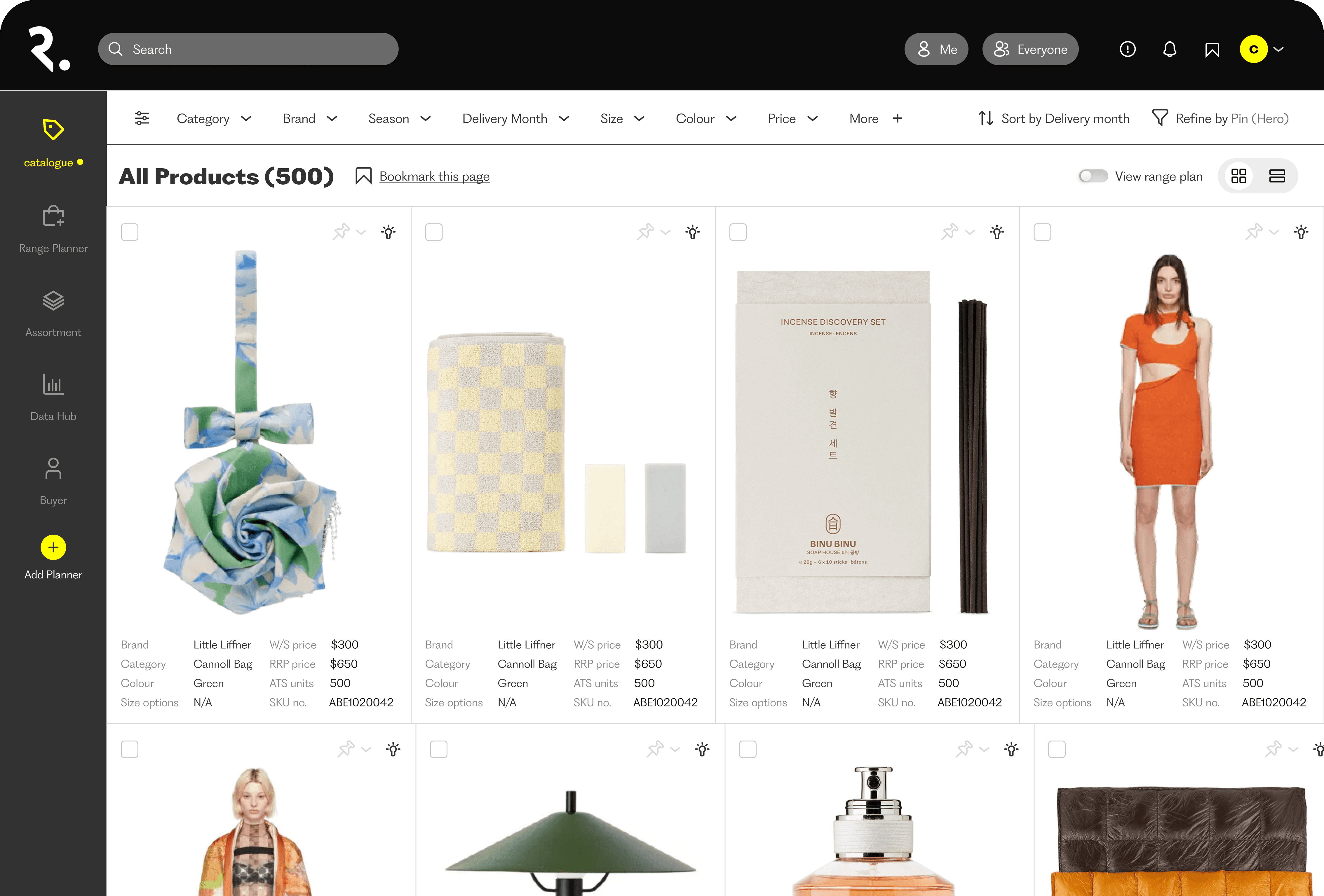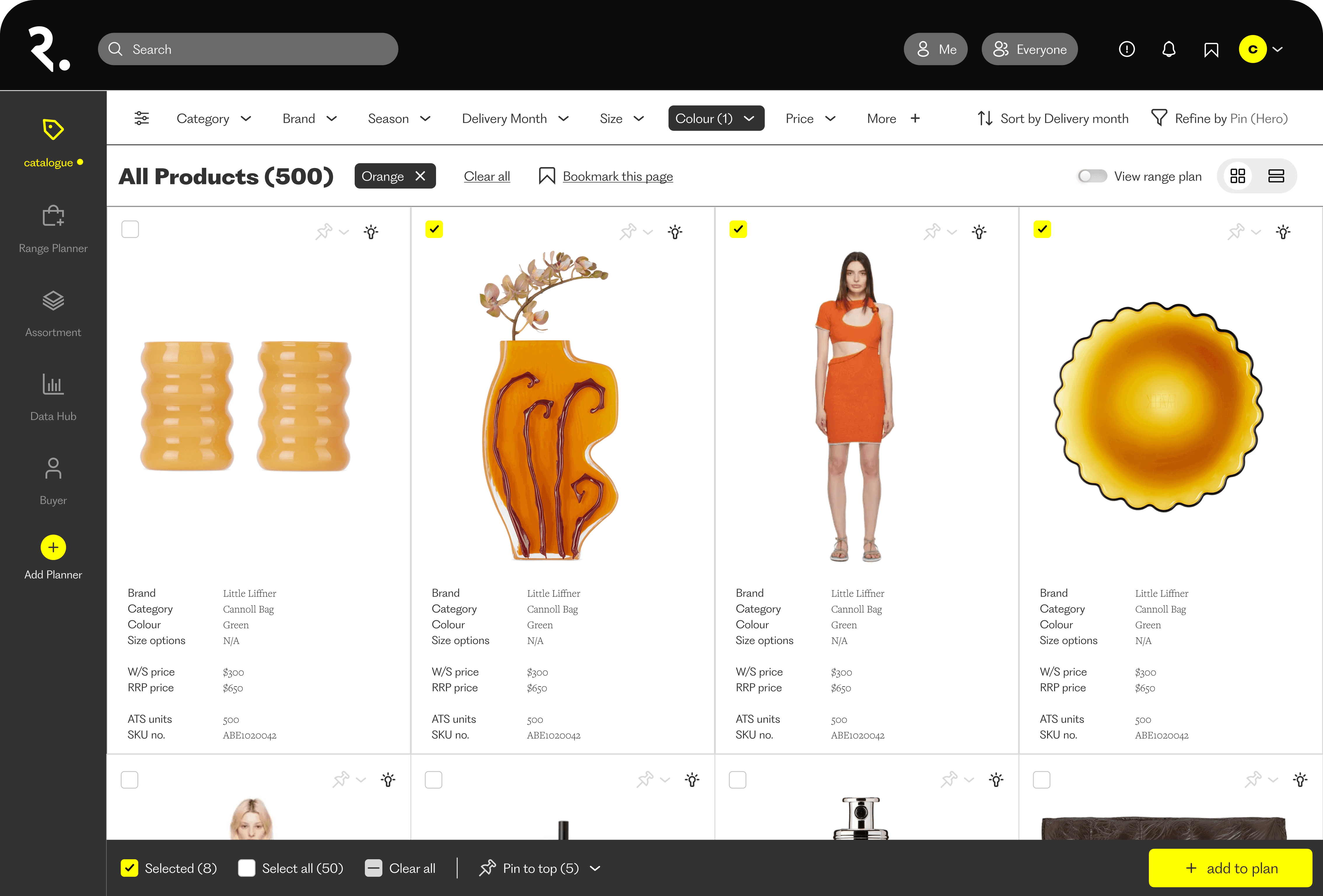 Buyers can multi-select products and create a new range plan or list directly from the catalogue. This reduces the typical context switch into spreadsheets during early planning.
