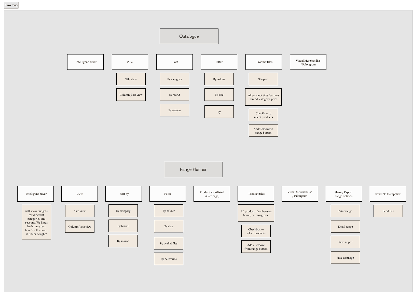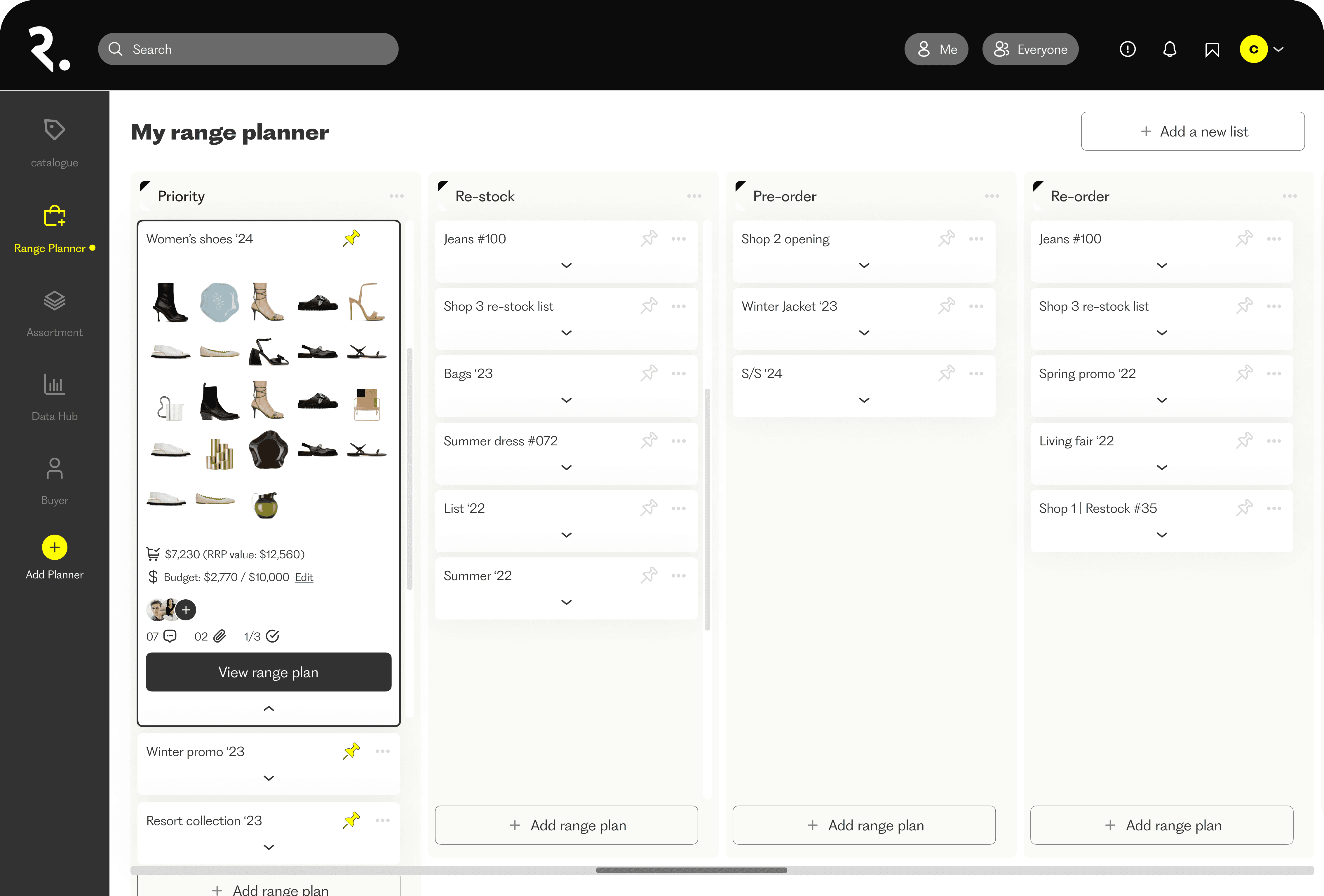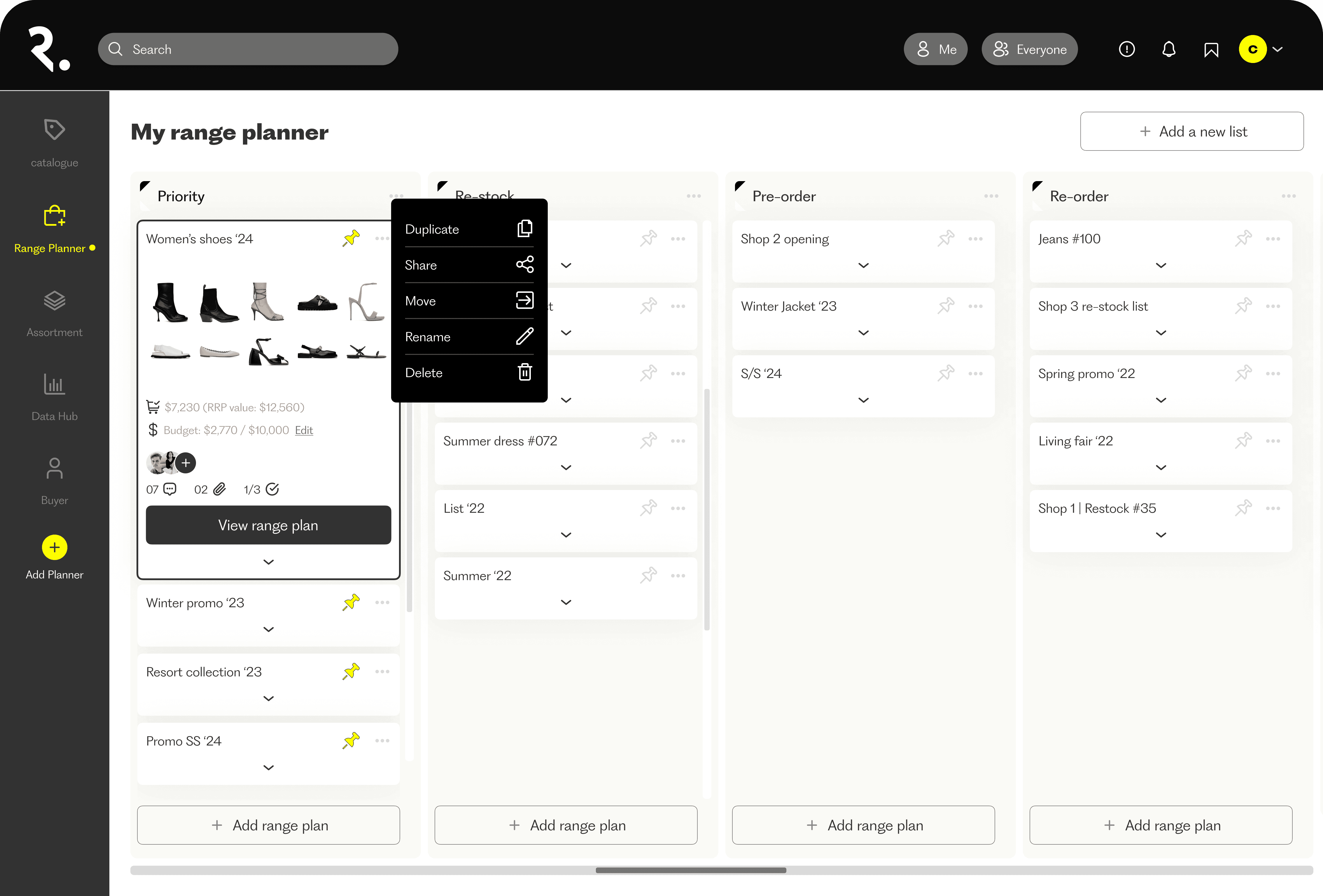 Range plans are organised by intent (priority, restock, pre-order, reorder) and can be duplicated, shared, moved, renamed, or deleted. This treats planning as a living workflow rather than a one-off export.