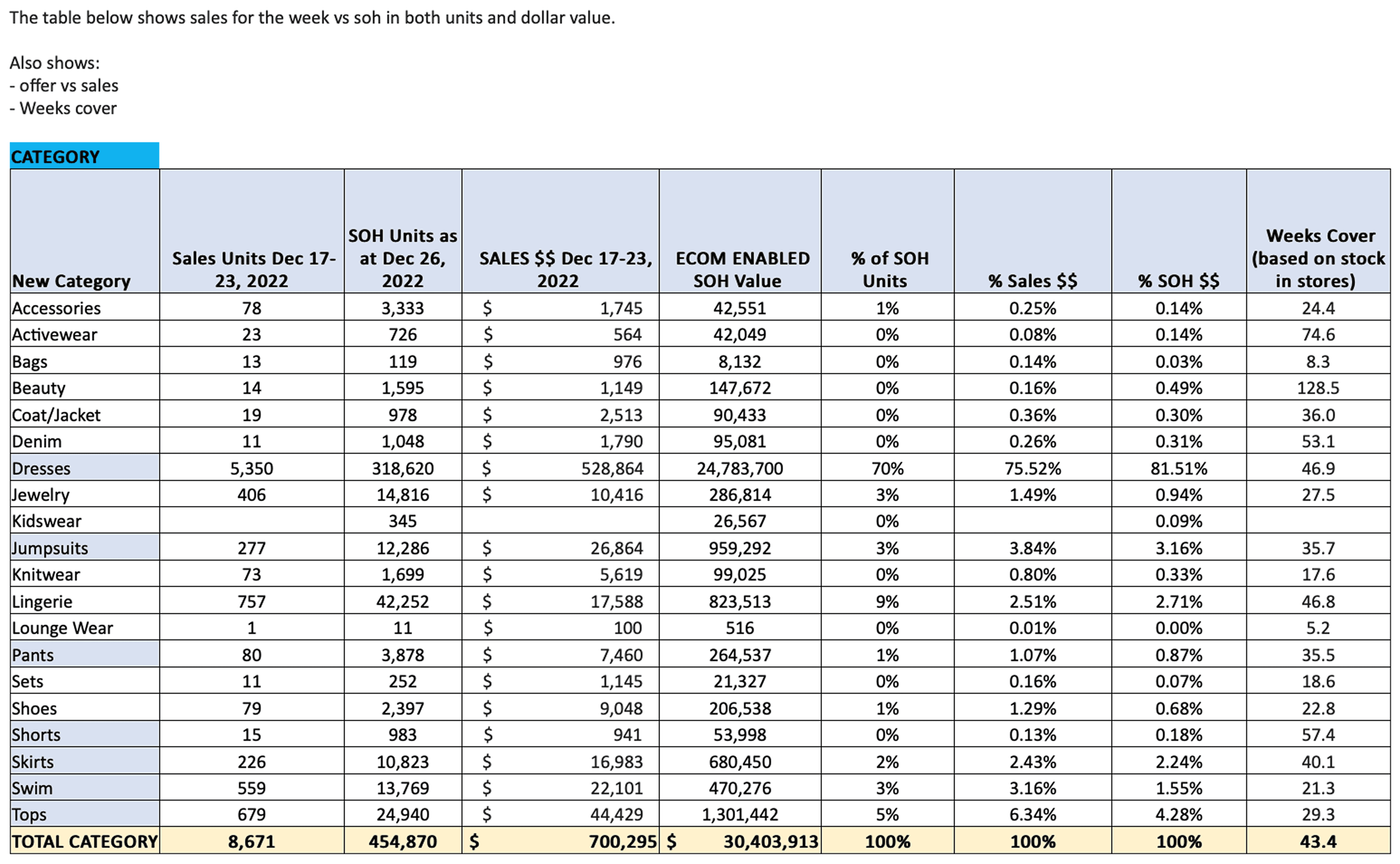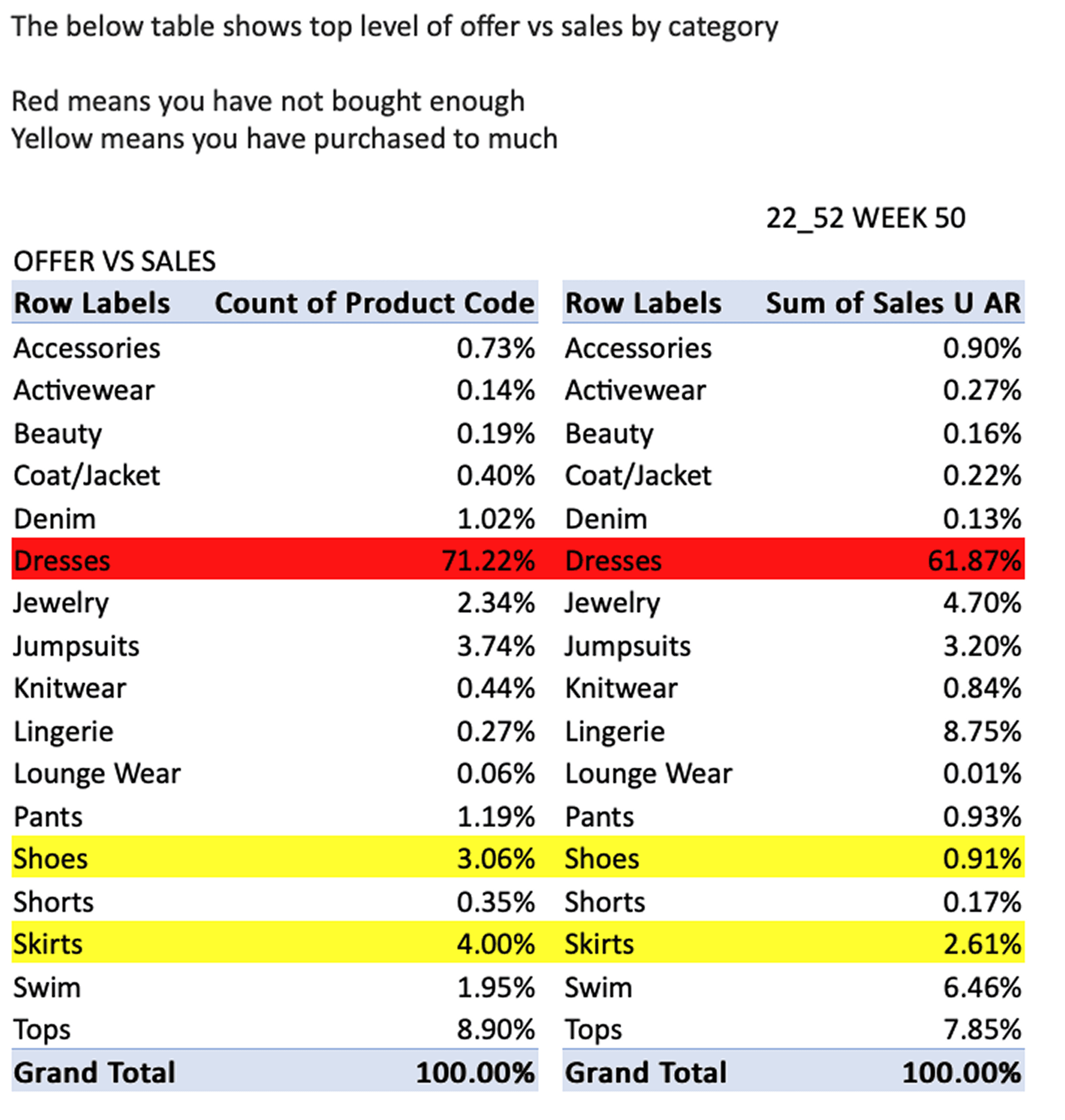 Spreadsheets persist because they support fast pivots across weeks cover, offer vs sales, and exception spotting.