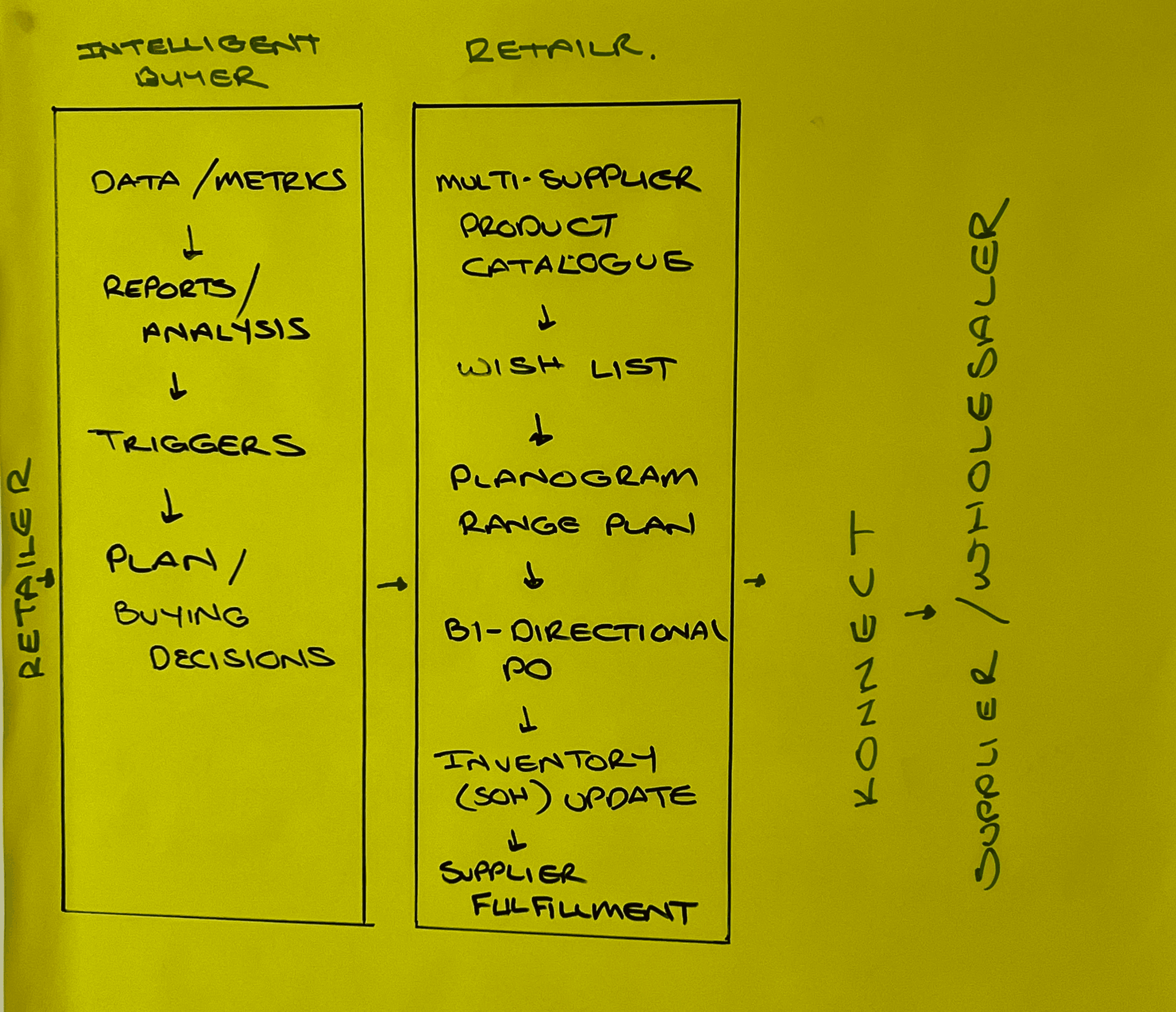 Retail buying spans sourcing, planning, allocation, PO, invoicing, and inventory updates across supplier, retailer, and accounting systems. The challenge was keeping the concept narrative simple without losing operational credibility.